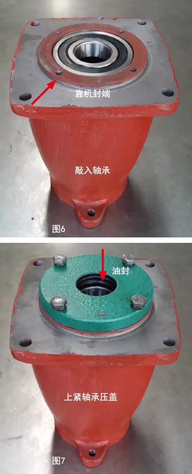 1、先安裝機(jī)封端的軸承,然后上緊軸承壓蓋(需敲入油封)。