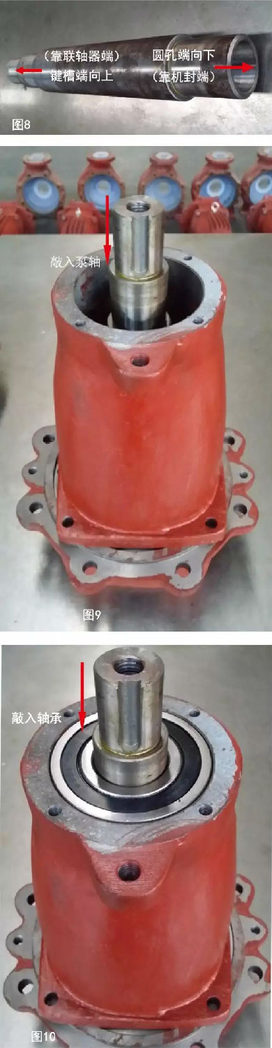 2、倒置并支起軸承箱,敲入泵軸(注意正反),敲入軸承。